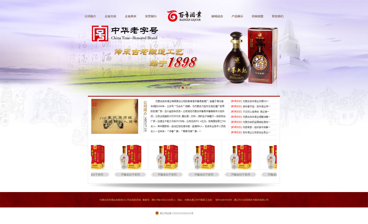 內(nèi)蒙古百年酒業(yè)有限責(zé)任公司的前身是開魯制酒廠,始建于1898年的“萬合永”燒鍋,迄今已有120多年釀酒歷史。企業(yè)歷經(jīng)了個(gè)體、國(guó)營(yíng)、轉(zhuǎn)制的變革和發(fā)展,現(xiàn)已成為集白酒、木糖、飼料生產(chǎn)銷售于一體的自治區(qū)農(nóng)牧產(chǎn)業(yè)化重點(diǎn)龍頭企業(yè),是通遼域內(nèi)首家榮獲國(guó)家商務(wù)部頒發(fā)的“中華老字號(hào)”企業(yè)。